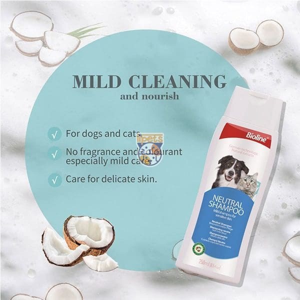 شامپو Bioline Neutral Shampoo با حجم ۲۵۰ میلی‌لیتر، فرمولاسیونی ملایم و فاقد رایحه و رنگ مصنوعی دارد که برای گربه‌ها و سگ‌ها با پوست حساس طراحی شده است. این شامپو با ترمیم التهاب و حساسیت‌های پوستی، از خشکی و خارش پوست جلوگیری می‌کند و به تقویت موها و حفظ سلامت پوست کمک می‌کند.