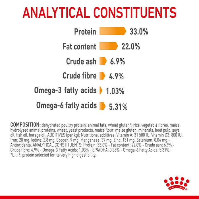 این غذای خشک گربه حاوی سویا و روغن گل گاوزبان است که حاوی اسیدهای لینولنیک گاما هستند و همچنین روغن ماهی که حاوی اسیدهای چرب امگا ۳ است. این ترکیبات به درخشندگی موها کمک میکنند. این کالا شامل ترکیب منحصر به فردی از ویتامینهای B، اسیدهای آمینه، روی و مس بوده که برای تقویت و ساخت کراتین مفید است. همچنین این غذا دارای ترکیبات ویژهای است که به برطرف کردن مشکلاتی مانند شوره، کدری و کمرنگی موها، سوزش پوست، ریزش مو و مشکلات دیگر پوست و موی گربه کمک میکند.
